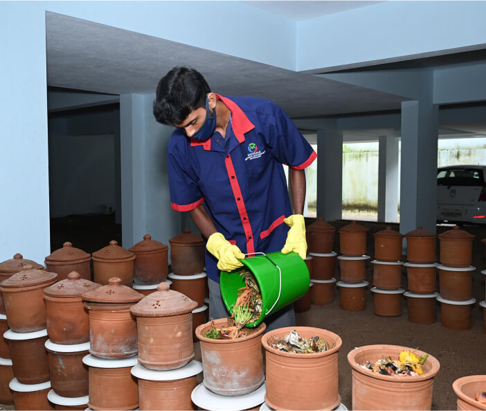 Our Zero Waste Project is a collaborative effort with local entities to implement sustainable waste management solutions. We adopt scientific methods, segregating kitchen and dry waste at the source. Kitchen waste is transformed into enriching compost using our unique “Black Soldier Composting” technique, while dry waste is carefully categorized and recycled.